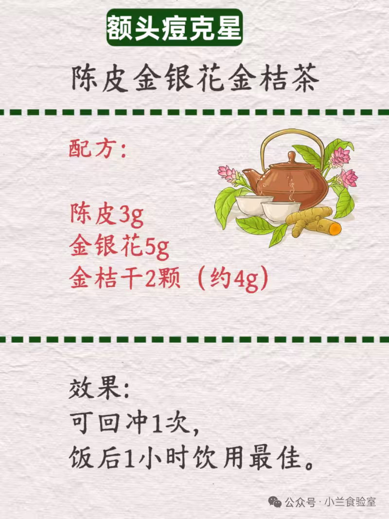 額頭痘 多與消化系統積熱有關,陳皮理氣燥濕,金銀花清熱解毒,金桔開郁行氣,三者協同化解胃熱。