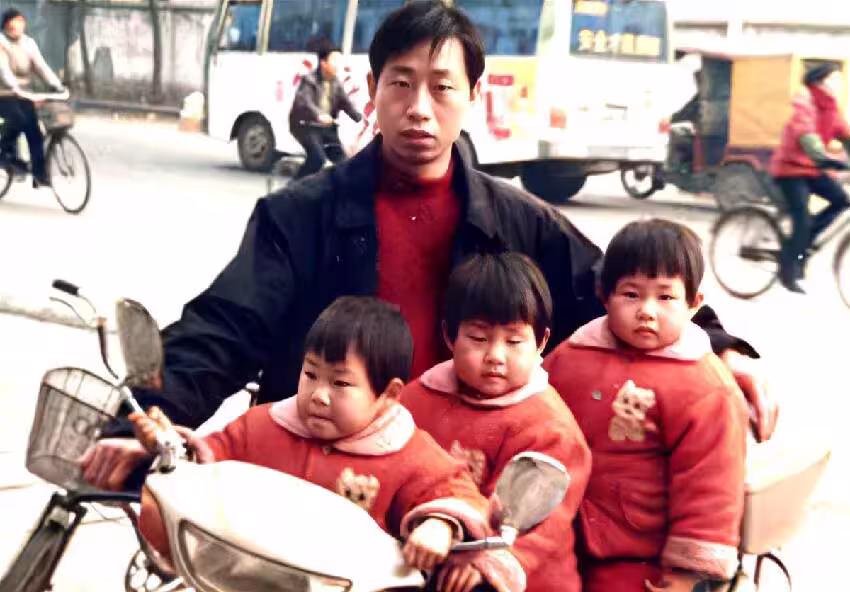 照片中,20年前他騎著摩托車載著三位穿著紅棉襖的幼小女兒;而20年後,三位女兒已亭亭玉立,穿著時尚,和父親重現了當年的經典場景。