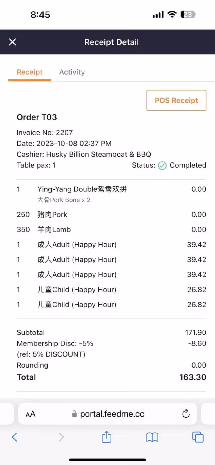 據了解,吃到飽的價格是小孩每人26.82令吉、大人39.42令吉,加上5%折扣8.60令吉,消費金額為163.30令吉(約1113新台幣),換算下來,該家人點了600盤肉僅花費台幣約1千出頭。