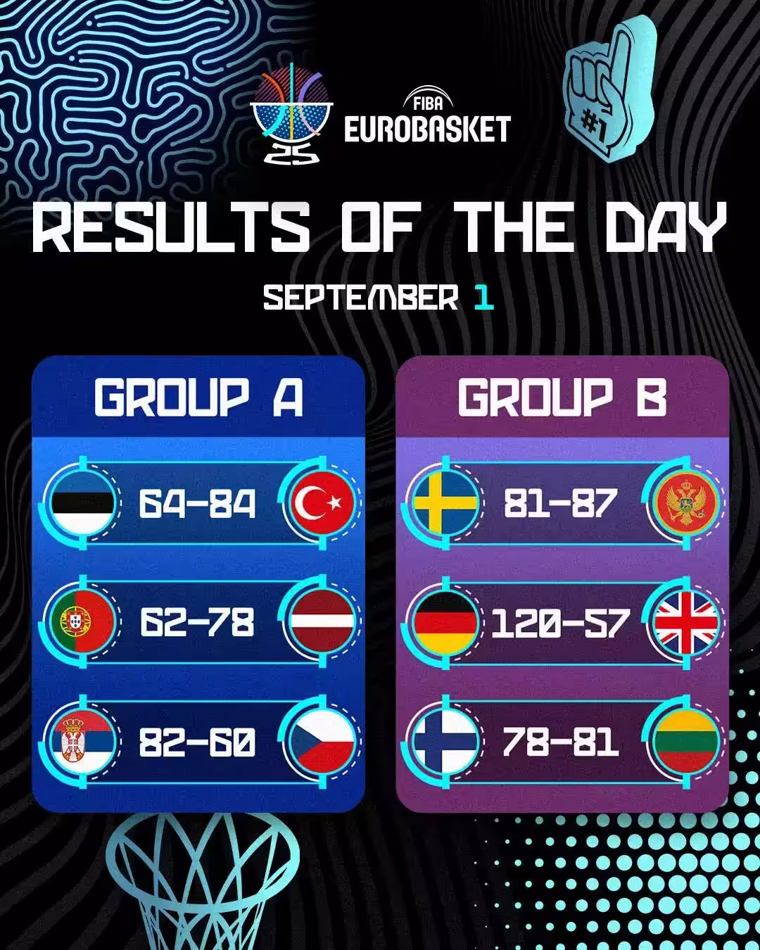 9月2日,男籃歐洲杯小組賽繼續進行,先來看比賽結果:愛沙尼亞64比84慘敗給土耳其;瑞典81比87輸給黑山;葡萄牙62比78不敵拉脫維亞;德國120-57狂勝英國;塞爾維亞82-60輕取捷克;芬蘭78-81憾負立陶宛。