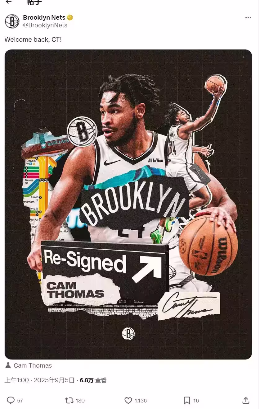 9月5日凌晨1點,布魯克林籃網官方宣布,受限制自由球員卡梅倫-托馬斯同意簽下1年600萬美元的資質報價,下賽季回歸籃網。他將在明年夏天成為完全自由球員,屆時離開籃網。無論如何,長達兩個月拉鋸戰終於結束了。