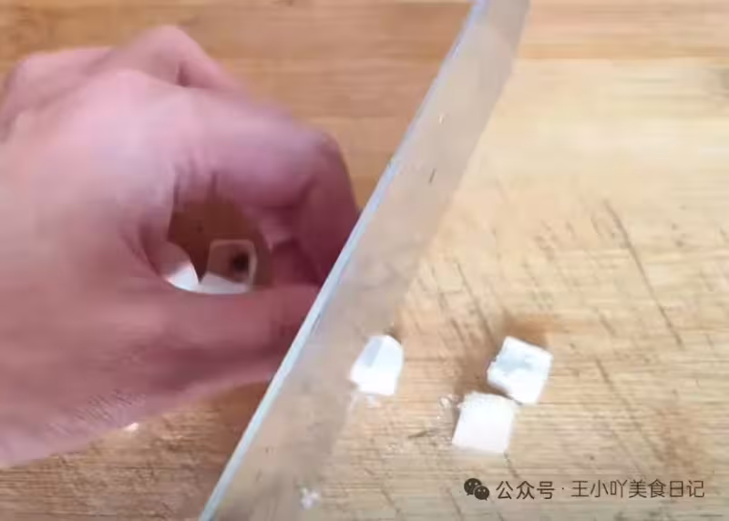 茯苓切塊:這時候,茯苓也泡好了,簡單清洗後,放在菜板上,用刀將每一粒茯苓從中間切開。這一步很關鍵,切開後的茯苓能更好地釋放營養,讓湯品更加濃郁。