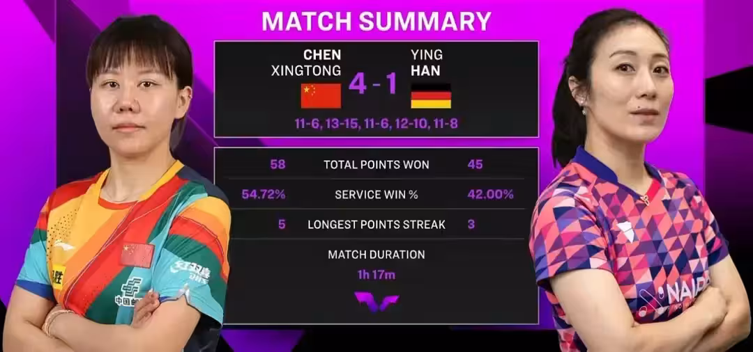 韓瑩可不是省油的燈。這位42歲的削球名將,用她標誌性的"牛皮糖"式打法,給陳幸同製造了足夠多的麻煩。首局11-6看似輕鬆,但第二局就給了中國隊一個下馬威——雙方從3平纏鬥到15平,最終韓瑩以15-13頑強扳平。要知道,削球手最擅長的就是打持久戰,能把比賽拖入拉鋸戰,本身就是種勝利。好在陳幸同及時調整,後三局穩住陣腳,以11-6、12-10、11-8連下三城。