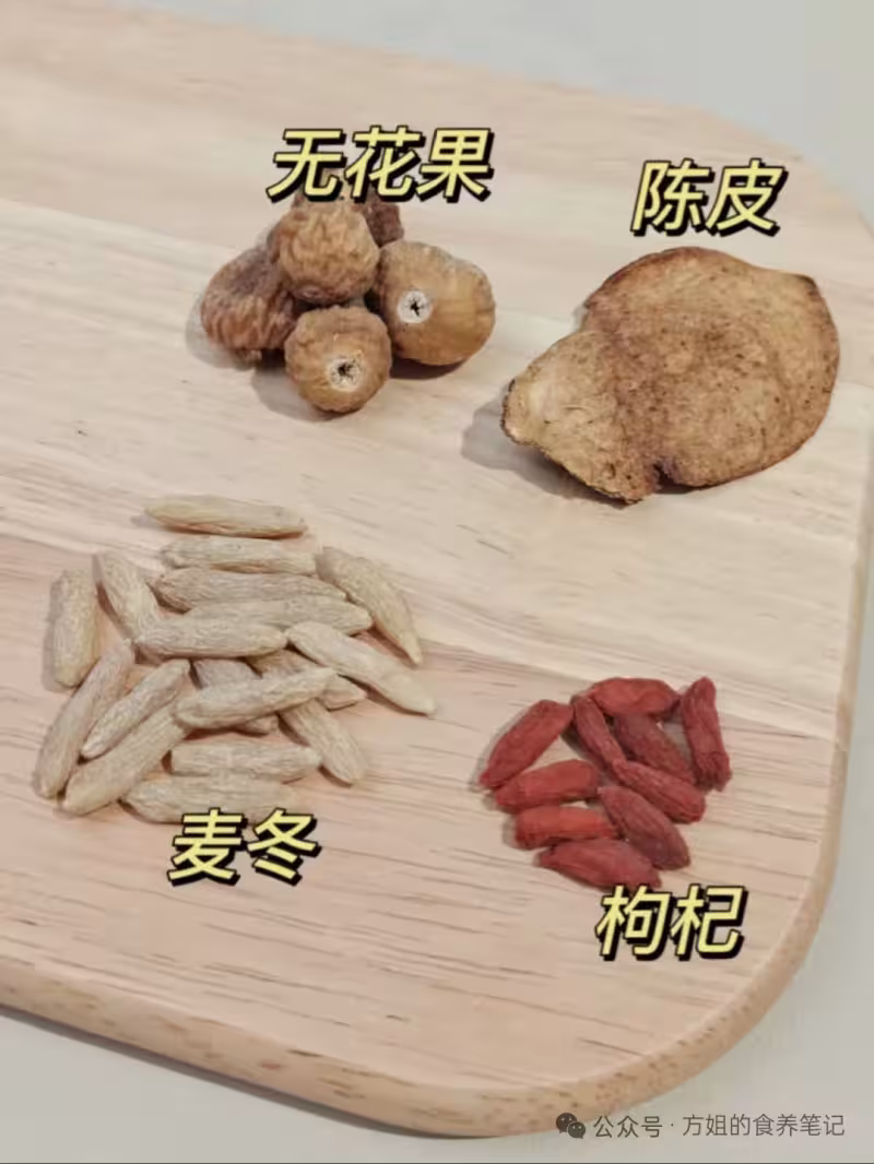 食材:麥冬10g;陳皮1片;枸杞10g;無花果3個