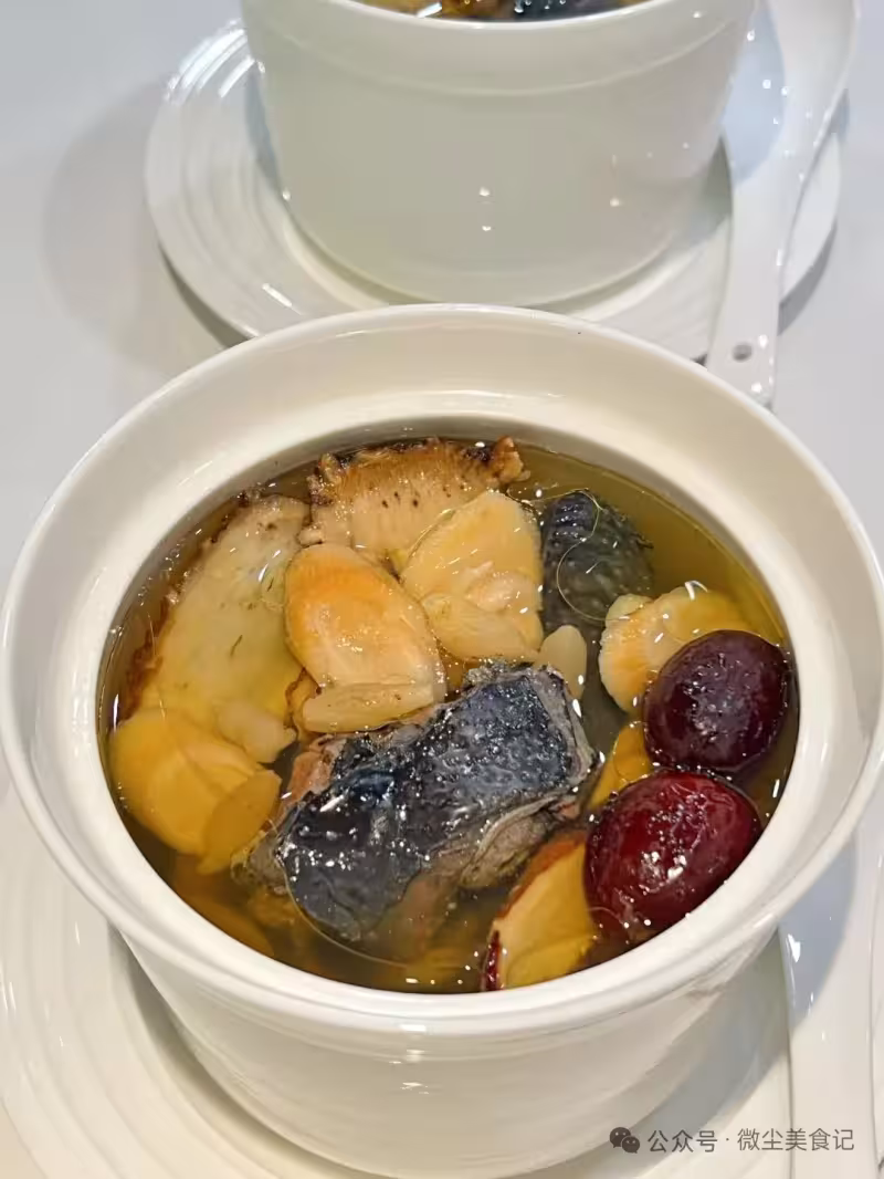 這款湯品選用烏雞、紅參、當歸等常見食材,搭配起來湯色清亮,味道溫潤適口,還帶有淡淡的藥香~現在提前喝起來,到了冬天手腳也不會冰冷~