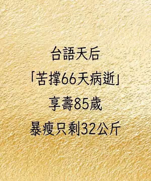 台語天后「苦撐66天病逝」享壽85歲,暴瘦只剩32公斤。