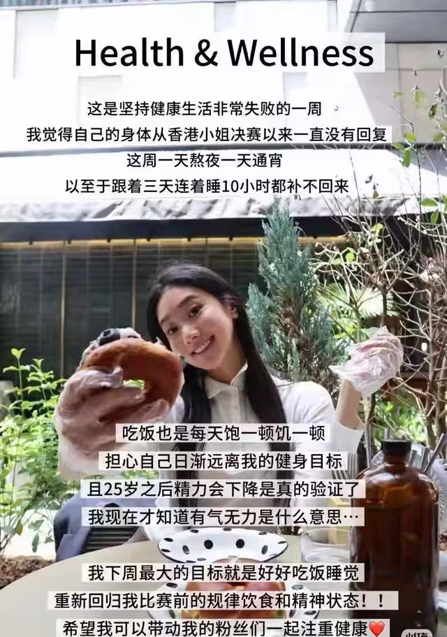 她更表示以前不知道辛苦是怎麼回事,如今也體會到了一些工作艱辛,更稱自己繼港姐之後,已經成為TVB的特種兵。她與現場的工作人員在閒時也有聊天,被問到為什麼有勇氣參選港姐,她直言不想被朝九晚五的生活所束縛,哪怕落選再繼續上班也不遲,最重要是青春無悔。