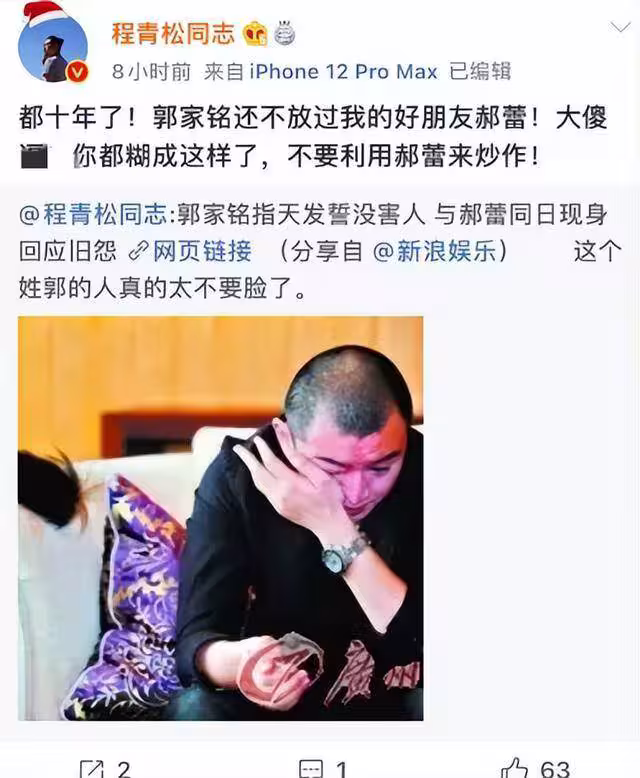 郝蕾兩次離婚,情緒最低落時都是程青松在身邊陪著;後來郭家銘炒作和郝蕾的舊情,把郝蕾推到風口浪尖,程青松第一時間在網上痛罵郭家銘。