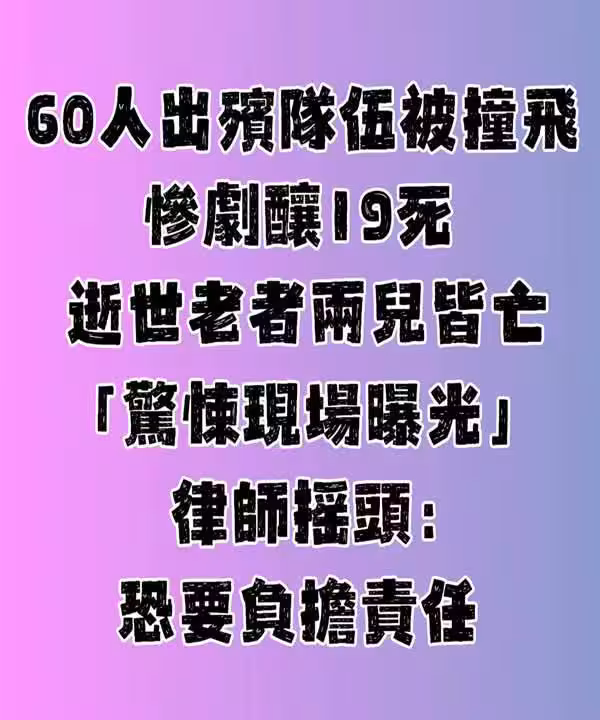 60人出殯隊伍被撞飛!慘劇釀19死「 逝世老者兩兒皆亡 」「 驚悚現場曝光 」律師搖頭:恐要負擔責任.