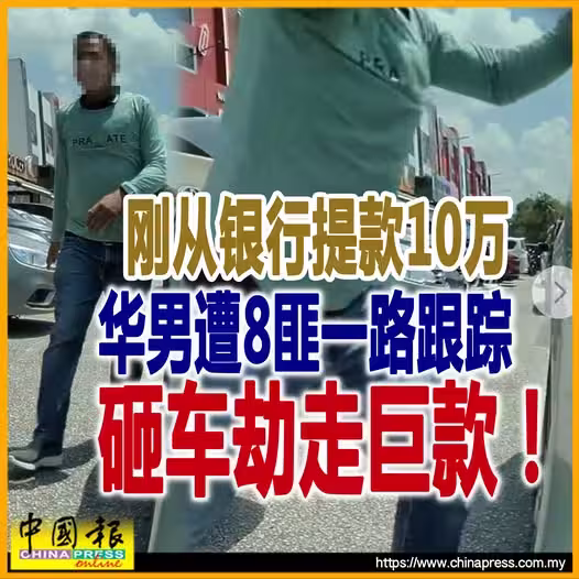 (新山26日訊)華裔男子剛從銀行提取10萬令吉現金,遭8名匪徒一路跟蹤,當他半途下車購物時,車窗即被砸破,短短一分鐘內劫走巨款!