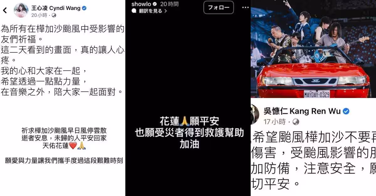 強台樺加沙重創花蓮藝人暖心發聲。圖片來源:FB@王心凌 Cyndi Wang、FB@吳克群Kenji Wu、IG@Show Lo、 IG@imayday55555 、FB@吳慷仁Kang Ren Wu、