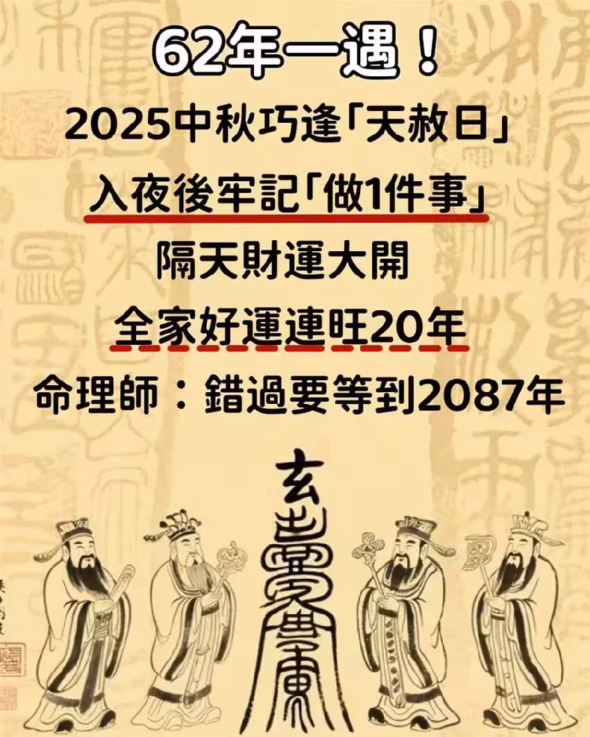 本世紀僅有兩次中秋與天赦日重疊,分別出現在2025年與2087年,錯過這次就得再等62年。