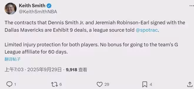9月29日,NBA記者Keith Smith補充報道,小丹尼斯-史密斯、傑里邁亞-羅賓遜-厄爾跟獨行俠簽的都是Exhibit 9合同。此前獨行俠官方宣布,球隊正式簽下這倆人。很多球迷只知道Exhibit 10合同,今天跟大家介紹一下Exhibit 9合同。
