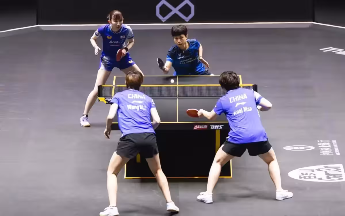 第四局開局繼續膠著的纏鬥,比分咬得很緊,一直來到中局的5-5,在近台的速度明顯提升,線路也積極在變化,也是給了更多的直線,王曼昱的反手今天發揮很出色,旋轉、質量、落點都是很有威脅,局末9-7領先,跨國組合打得也很挽救,挽救賽點,雙曼組合仍然12-10贏下最終比賽,大比分3-1實現逆轉奪冠。
