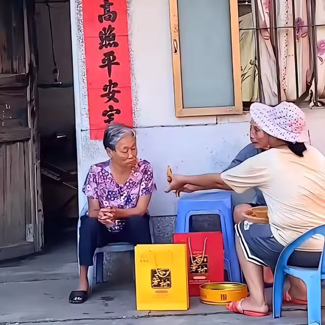 全紅嬋媽媽給奶奶的禮品也是高檔,包裝的盒子比較精緻。全紅嬋奶奶年紀大了,但整個人收拾得很利落,看起來精神頭不錯。