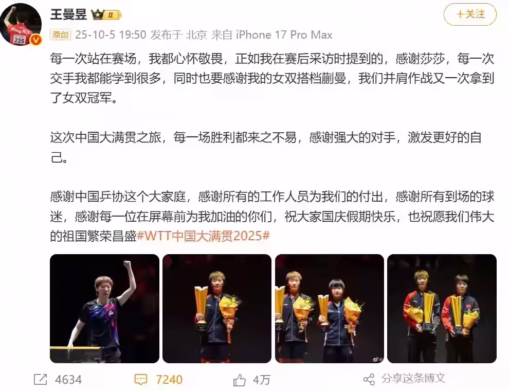 在她眼中,勝利從不是孤軍奮戰的結果。「感謝強大的對手,激發更好的自己」,是對賽場競爭的深刻理解;「感謝中國乒協這個大家庭,感謝所有工作人員」,是對幕後支撐的銘記;「感謝球迷的加油」,是對支持者的回饋。文末那句對國慶的祝福與對祖國的祝願,更讓個人榮耀與家國情懷相連。此時的孫穎莎雖憾失女單亞軍,卻也收穫混雙冠軍,同樣展現了頂尖實力。而王曼昱的雙冠與致謝,恰是國乒傳承的縮影:對手亦是良師,搭檔皆是戰友,在競爭中成長,在團結中奮進。