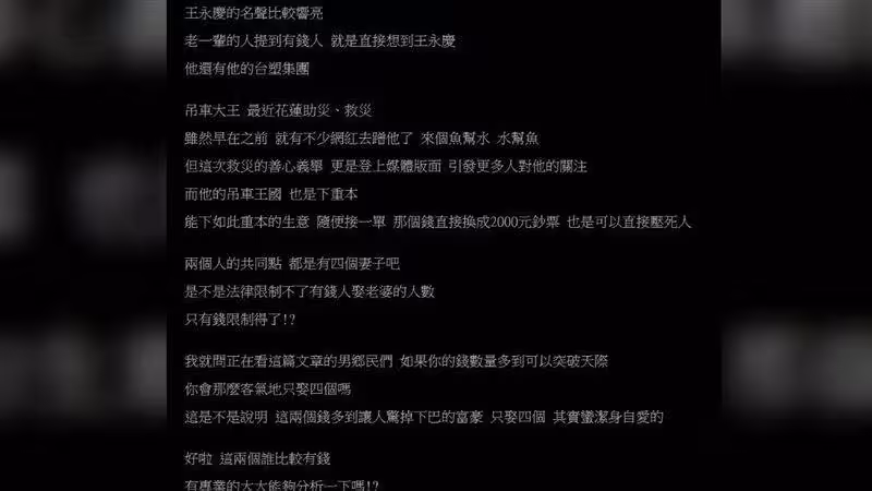 其他網友則認為「王永慶算富可敵國,吊車大王頂多地方霸主」、「王永慶隨便一個帳戶都虐」、「王永慶吧!光海外就幾百億了」、「台塑有醫療、半導體、自己的港口」。