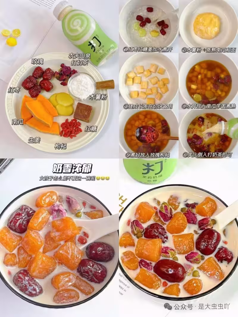 玫瑰、紅棗、南瓜、生薑、枸杞、紅糖、木薯粉、農夫山泉打奶茶。