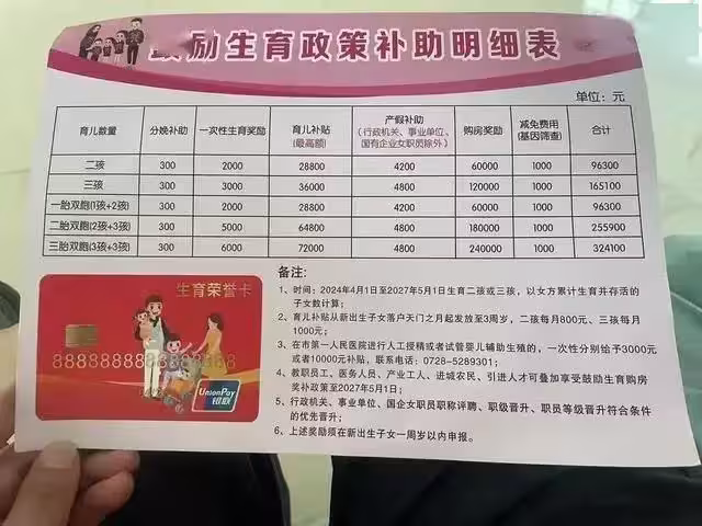 以天門市為例,該市通過「二孩獎勵2000元+月補800元+6萬房補」;