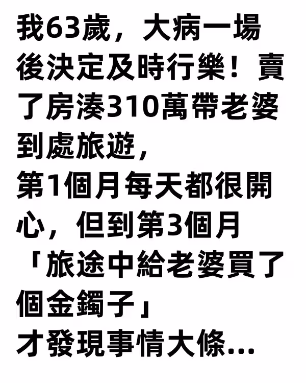 我63歲,大病一場後決定及時行樂!賣了房湊310萬帶老婆到處旅遊,第1個月每天都很開心,但到第3個月「旅途中給老婆買了個金鐲子」才發現事情大條...