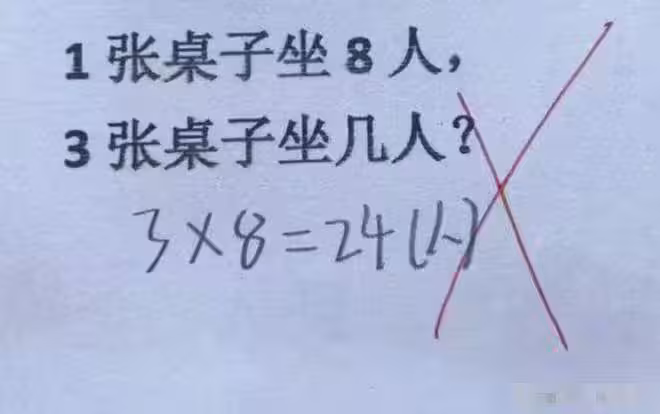 比如這個二年級的數學題:1張桌子坐8人,3張桌子坐幾人? 有人覺得這個題目有多種答案,具體答案是什麼,應該由桌子排列的樣式決定。
