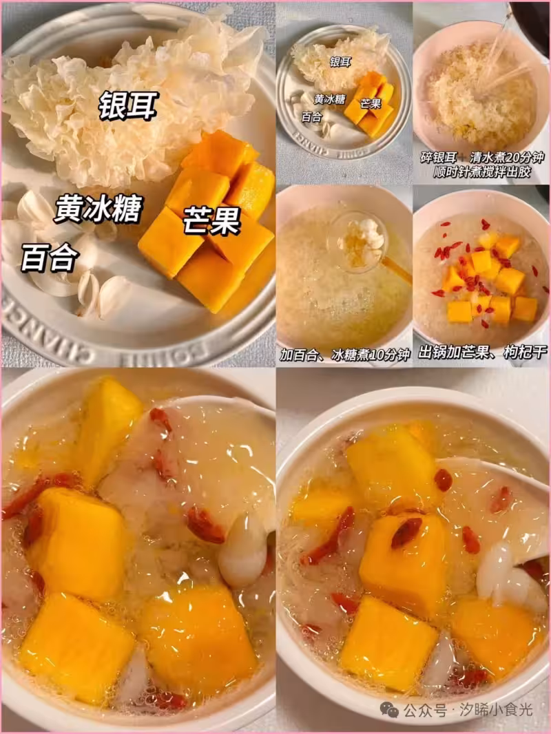 食材:銀耳、黃冰糖、芒果、百合、枸杞干 製作步驟: