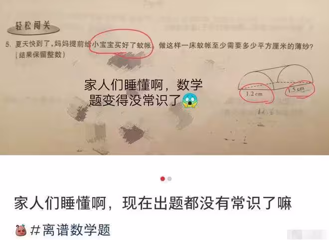 5厘米、1.2厘米。一位媽媽覺得這個數學題不符生活常識,嚴重脫離生活實際。