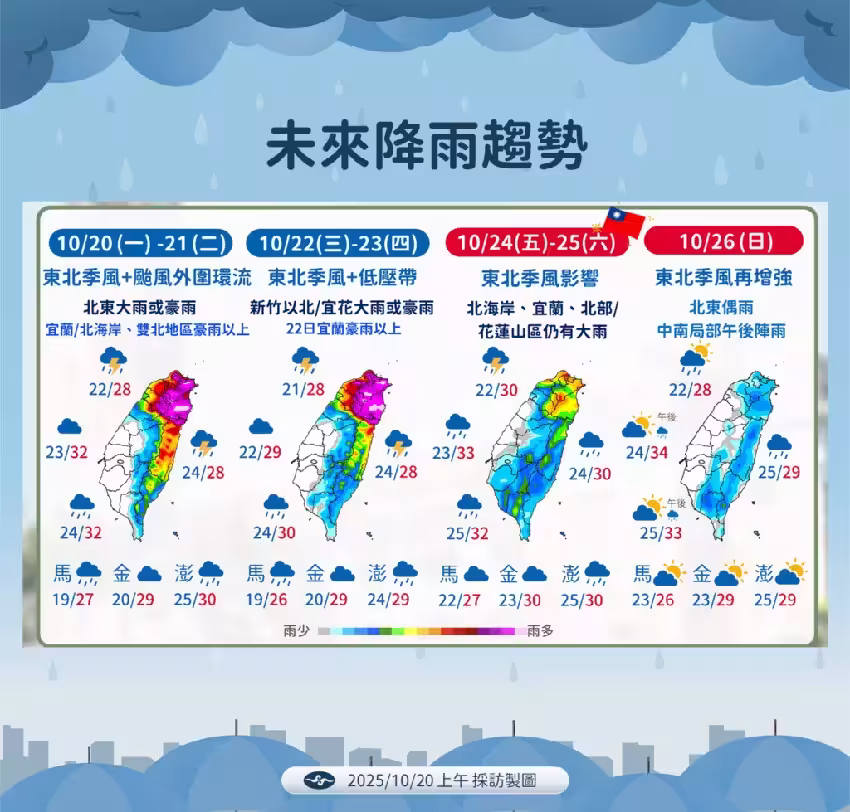 對此,中央氣象署提醒,今 (20) 晚至明 (21) 日,白天北台灣及東半部仍受東北季風與颱風外圍環流雙重影響,降雨將持續,部分地區恐出現短時強降雨,民眾應留意道路積水、山區坍方及土石流等災害,外出務必注意安全,並隨時關注各縣市政府最新停班停課及氣象資訊。