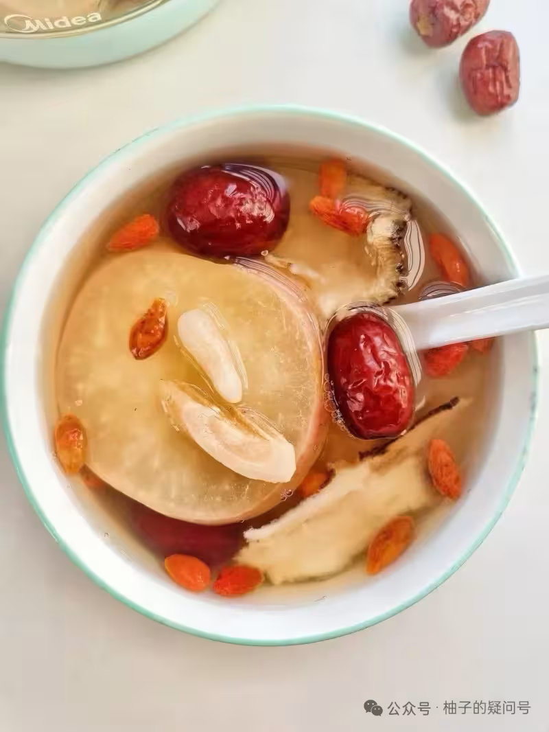 蘋果和當歸、黃芪搭配在一起,喝起來帶點清甜,身體暖暖的。蘋果本身就潤燥養人,加了點藥材,氣色都紅潤不少。