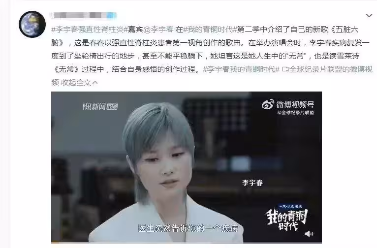 2021年,她被定位為「僵直性脊椎炎」——一種稱為「不死」癌症的慢性疾病。 雖然不會直接危及生命,但它會「凍結」人的脊柱,帶來持續性疼痛和功能性損傷,甚至可能讓人慢慢失去基本的生活自理能力。 嚴重的時候,豎立都受到了挑戰,更別說躺著睡覺了,她曾在綜藝節目《我的青銅時代》中罕見地表示,自己有一段時間連睡覺都無法平躺,只能靠著坐著休息。