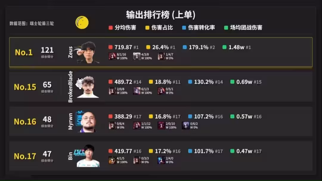 英雄聯盟2025全球總決賽,在休賽兩天之後,瑞士輪第四輪即將打響,UP主李蘭香在近日,對前三輪上單選手數據進行了統計,LPL三位上單,聖槍哥超出預期,369中規中矩,Bin哥則是一拉到底,先看看三大上單數據情況,輸出排行榜,369僅次於宙斯、比巴卜、阿志,位列榜單第四。