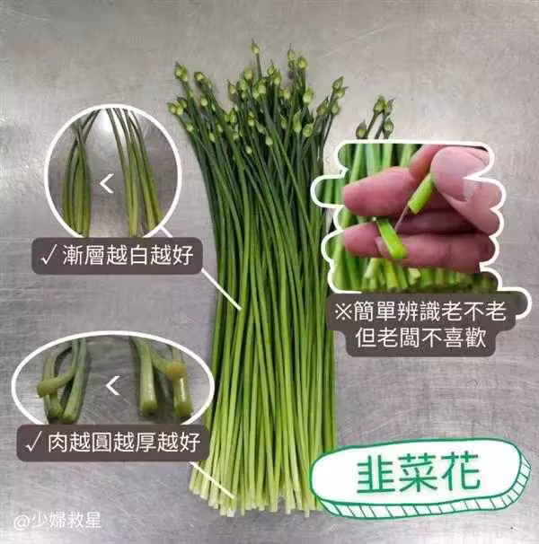 劉學民提到,韭菜花是韭菜的「花苞」,主要產季在8~10月,付富富含葉酸、維生素A及膳食纖維,根據了解,每100公克的韭菜花,脂肪僅0.4克,但膳食纖維達2.9克,可謂低熱量的高纖食物,營養密布相當高。