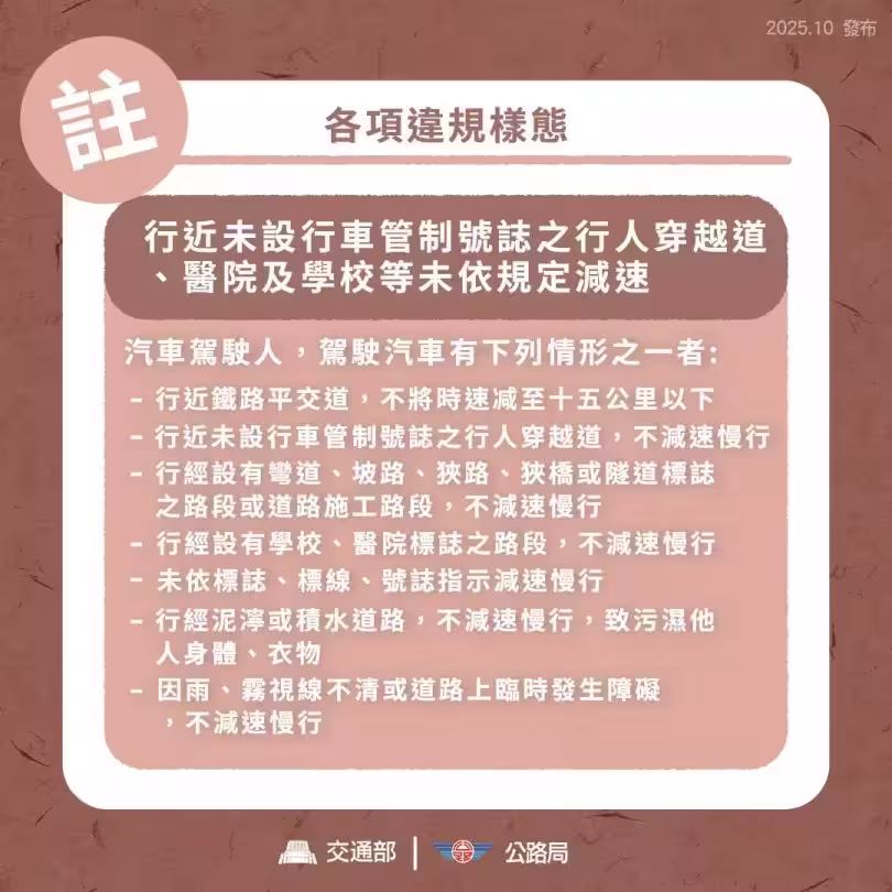 至於行近特定路段未依規減速,則包括行近鐵路平交道,不將時速減至15公里以下;行近未設行車管制號誌之行人穿越道,不減速慢行;行經設有彎道、坡路、狹路、狹橋或隧道標誌之路段或道路施工路段,不減速慢行;行經設有學校、醫院標誌之路段,不減速慢行;未依標誌、標線、號誌指示減速慢行;行經泥濘或積水道路,不減速慢行,致污濕他人身體、衣物;因雨、霧視線不清或道路上臨時發生障礙,不減速慢行。