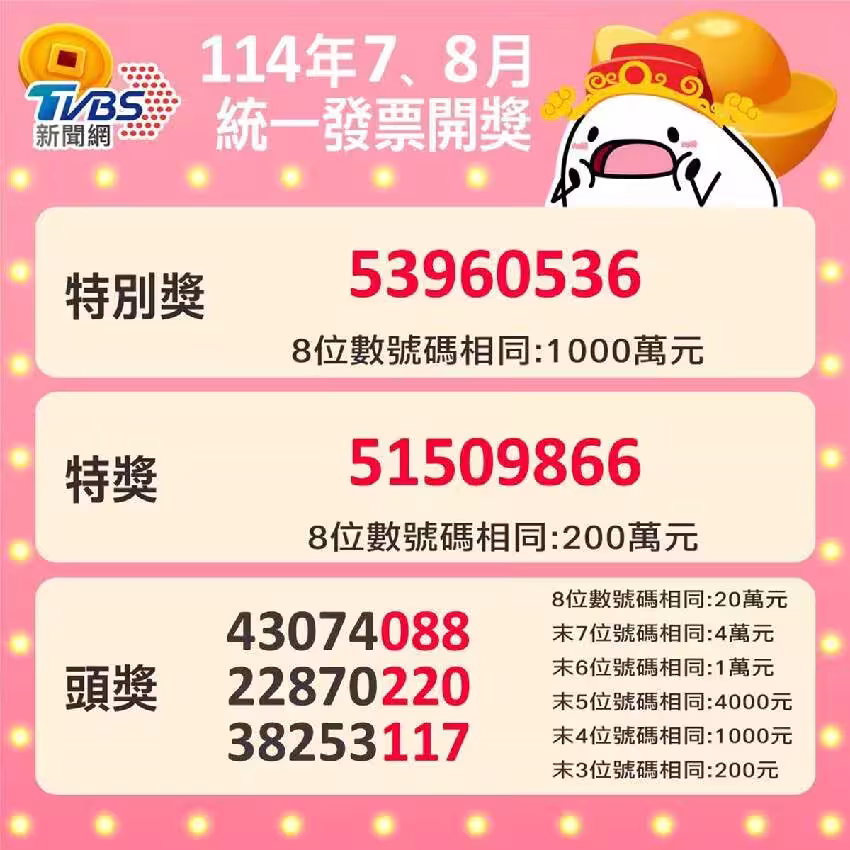 114年7、8月期統一發票中獎號碼曝光,千萬特別獎號「53960536」,17人中獎;200萬特獎獎號「51509866」,開出17張中獎發票。