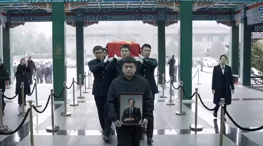 告別式開始時,一名中年男子捧著楊振寧的遺照,走在棺槨的前面。