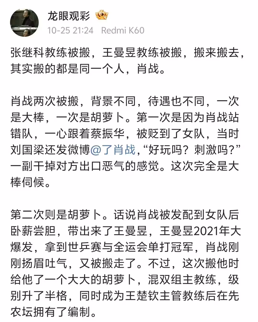 在賀曉龍看來肖戰的執教風格完全不一樣了,他做王楚欽的場外指導時總是面帶微笑,執教風格除了慈祥還是慈祥。不過後來他就不做場外指導了,王楚欽的場外指導現在已經變成王皓,再也看不到肖戰做王楚欽的場外指導了。賀曉龍充分認可肖戰的執教能力,在他看來能被搬來搬去的絕對是個能人,要是個廢柴就會一直在王曼昱身邊。