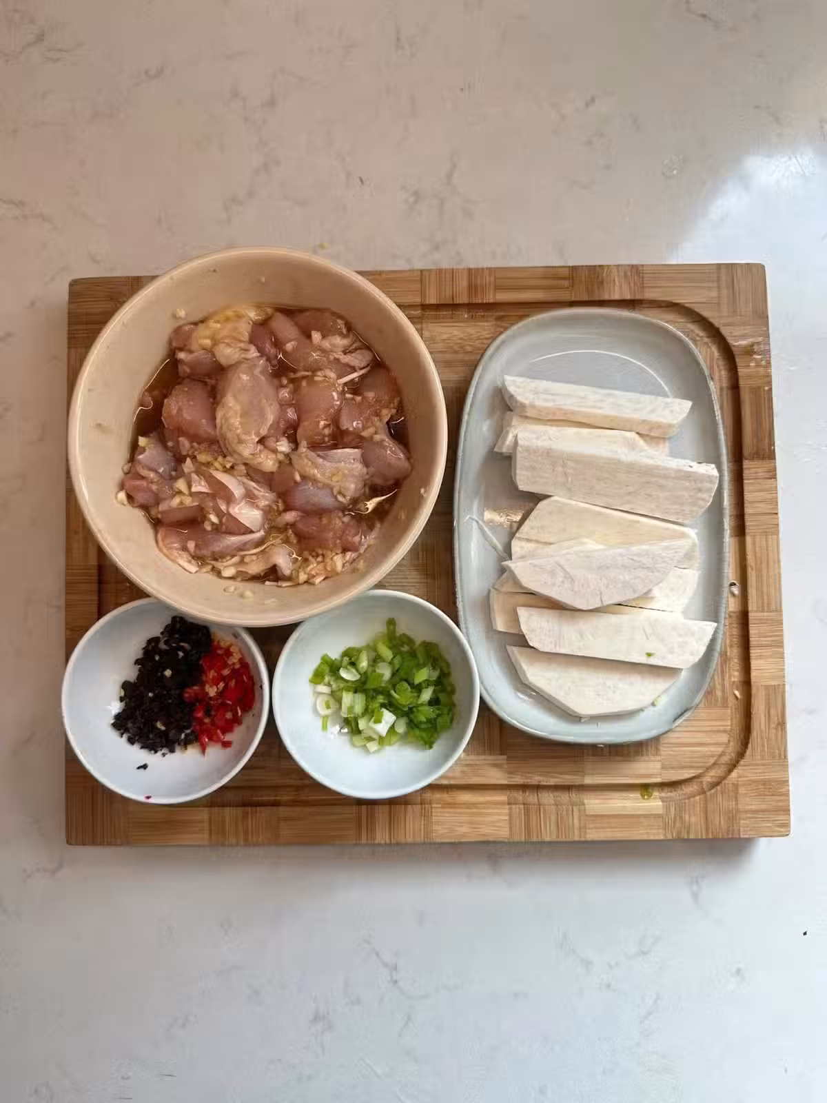 1️⃣雞肉加一勺料酒,一勺生抽,一勺蚝油,半勺糖,半勺鹽,少許白鬍椒,倒入姜蒜末,抓勻腌制10分鐘