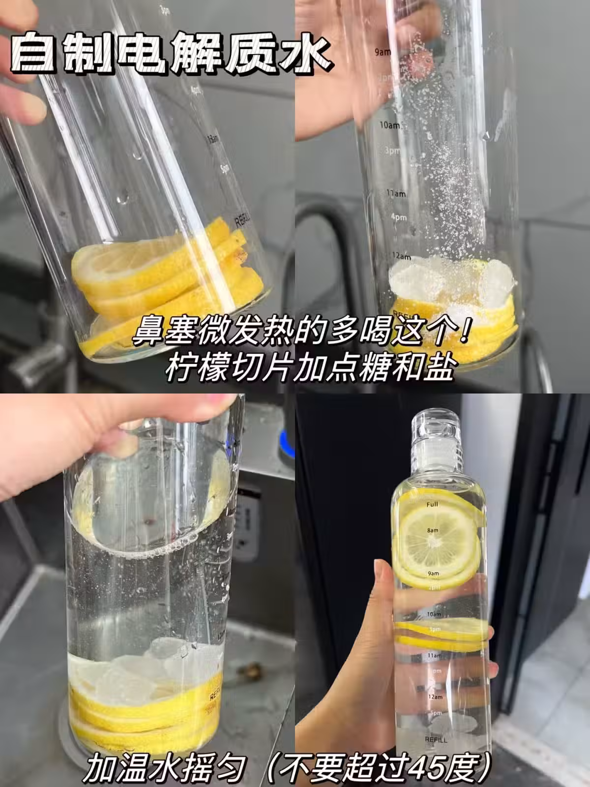 做法:將5片檸檬+鹽適量+糖適量放進容器。倒入溫水搖晃(溫水不可以超過45°)