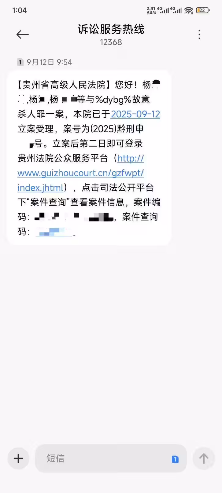2025年9月12日的時候,被害人家屬收到了貴州省高院12368訴訟服務熱線的簡訊通知,告訴他們這個案件已經正式立案受理了。