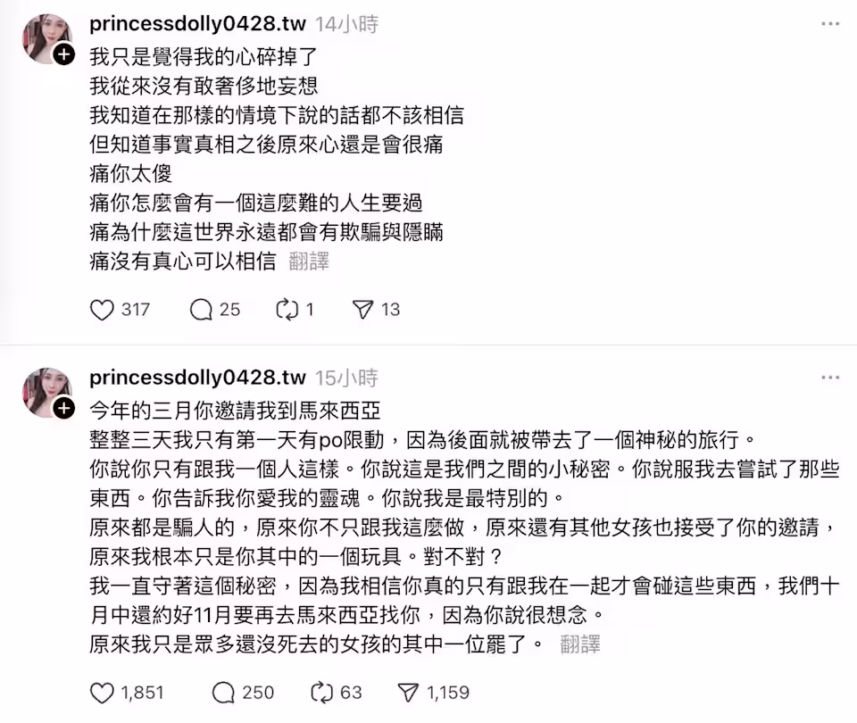 翁雨澄心碎喊話,「原來還有其他女孩也接受了你的邀請,原來我根本只是你其中的一個玩具。對不對?」她無奈表示,自己一直苦守秘密,因為相信黃明志只有和她待在一起時才會碰毒品,「我們十月中還約好11月要再去馬來西亞找你,因為你說很想念。原來我只是眾多還沒死去的女孩的其中一位罷了。」似乎影射對方欺騙感情,字裡行間全是悲憤情緒。