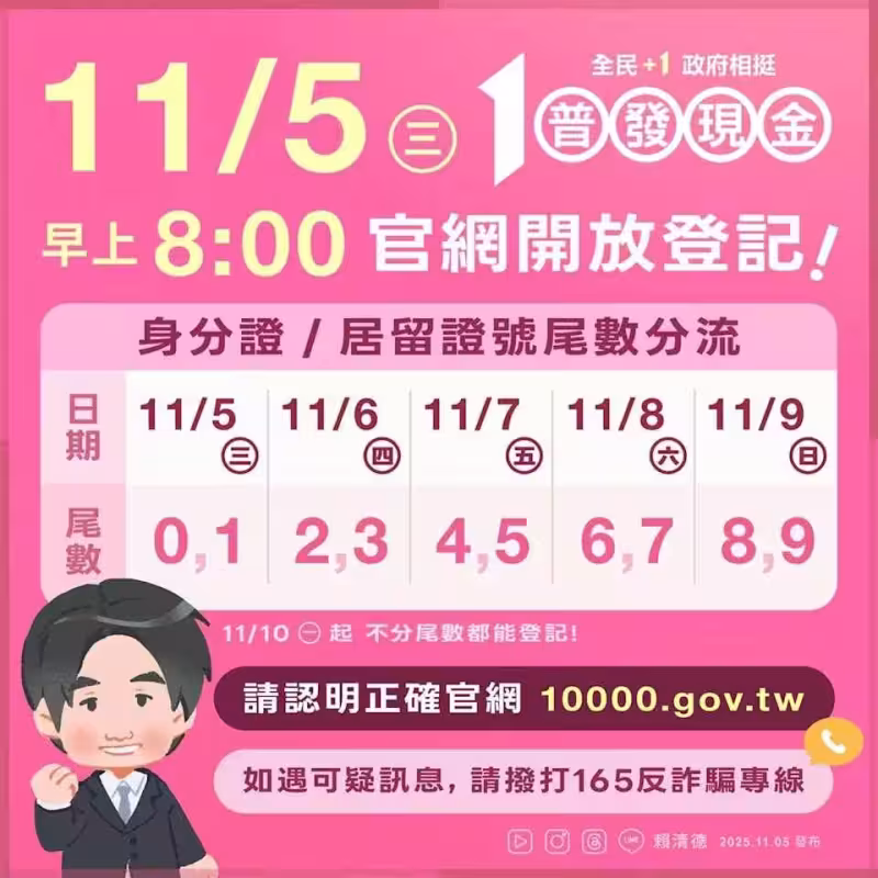在大家最關心的入帳速度方面,財政部補充說明,凡於預登記期間及11月10日當天完成登記並經系統檢核成功的民眾,款項將於11月11日下午6時起至11月12日陸續入帳,最快隔天就能看到錢進戶頭。11月11日以後登記成功的民眾,款項則會在登記後的兩個營業日內入帳。財政部也提醒,登記入帳開放時間非常充裕,將持續至115年4月30日,請民眾無需焦急。若民眾自11月13日起查詢登記結果,發現因資料錯誤導致登記或入帳失敗,網頁也會提示原因並開放重新登記,或者民眾可以改採自動提款機或郵局領現,權益不會受損。