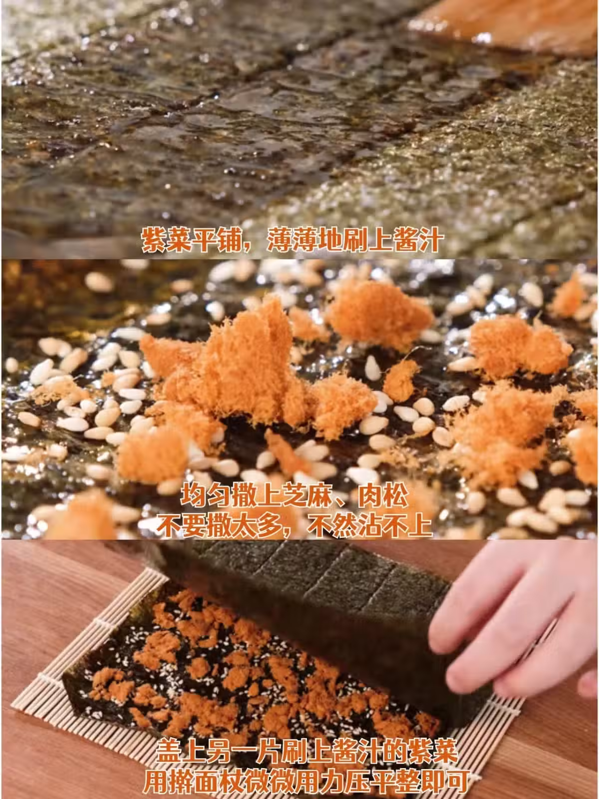 它既是調味劑,也是粘合劑,在麥芽糖和蚝油的增稠作用下,細碎的夾餡可以牢牢地粘在海苔上。 🤗我今天展示的夾心是肉鬆和芝麻,其他堅果如杏仁片、南瓜籽也可以加入。