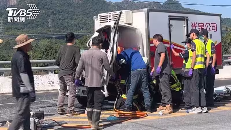 同日在南投草屯鎮也發生車禍。消防人員必須出動工具破門,因為食品冷凍貨車司機受困車內。在草屯台14線上,45歲胡姓駕駛疑似因開車分心,撞上前方準備右轉的砂石車。被撞的砂石車駕駛表示,對方沒有停車就從後面撞過來,當時是綠燈。砂石車駕駛雖感到無辜,但也慶幸自己沒有受傷,而胡姓駕駛則臉部及全身多處擦傷。