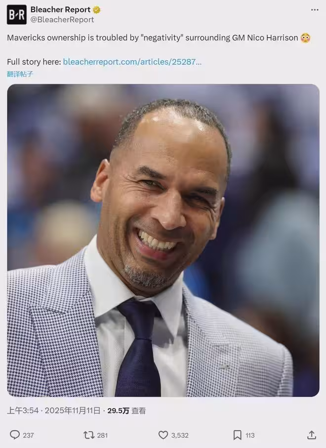 11月11日,據NBA名記Tim MacMahon和Marc Stein最新報道,由於獨行俠戰績不佳,球隊老闆杜蒙特和總經理尼科-哈里森的關係已徹底破裂。兩人之間的信任"完全瓦解",杜蒙特親自介入球隊事務,哈里森被解僱只是時間問題。