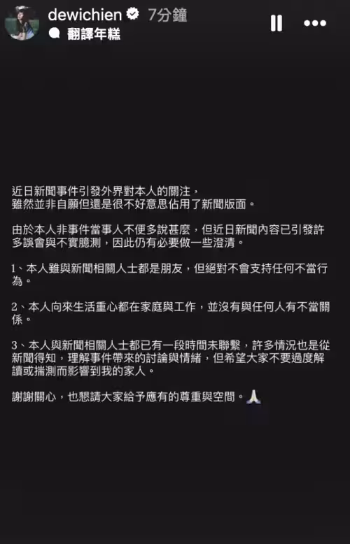 ▲簡廷芮否認出軌,也說自己不清楚王子與粿粿的私情。(圖/簡廷芮IG@dewichien)