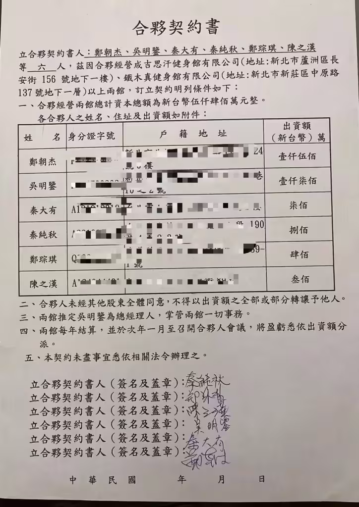 此外,總監吳明鑑也在臉書公開當年健身房「合夥企業契約書」,內容顯示共有6位合伙人,出資總額5400萬元,而館長的出資僅300萬元,是全員中最少的一位。他直言:「幸好我大姐當初有留存副本」,並標註:「陳先生你也有簽名喔!」