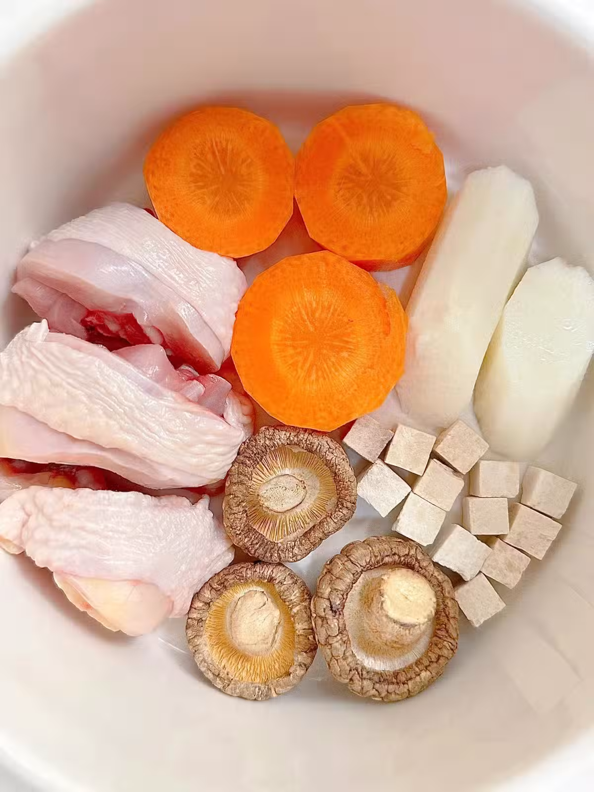3️⃣湯鍋中放入雞肉,香菇,胡蘿蔔,薏米,茯苓倒入適量開水燉煮1個小時