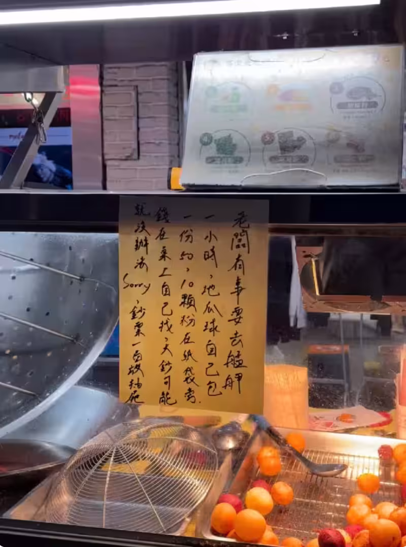 一名網友以「論台灣人的信任程度」為題在Threads貼出照片,當時原PO在經過該地瓜球攤時,發現正在裝地瓜球的人站在攤位側邊,看起來不太像老闆,於是她繞去攤位正面,才發現老闆留下一張紙條,內容表示因有事要去艋舺,採取自助式販售方式,每份50元有10顆地瓜球,顧客需要的話自行盛裝並找零。