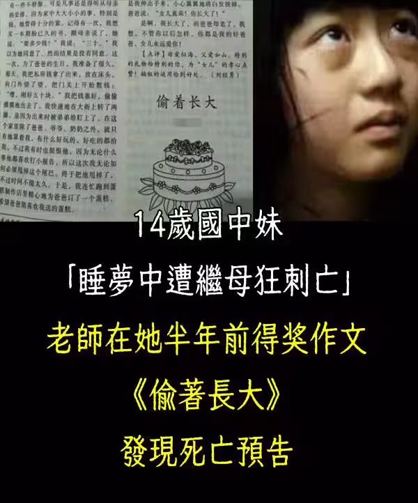 14歲國中妹「睡夢中遭繼母狂刺亡」,老師在她的半年前得獎作文《偷著長大》發現死.亡預告!!