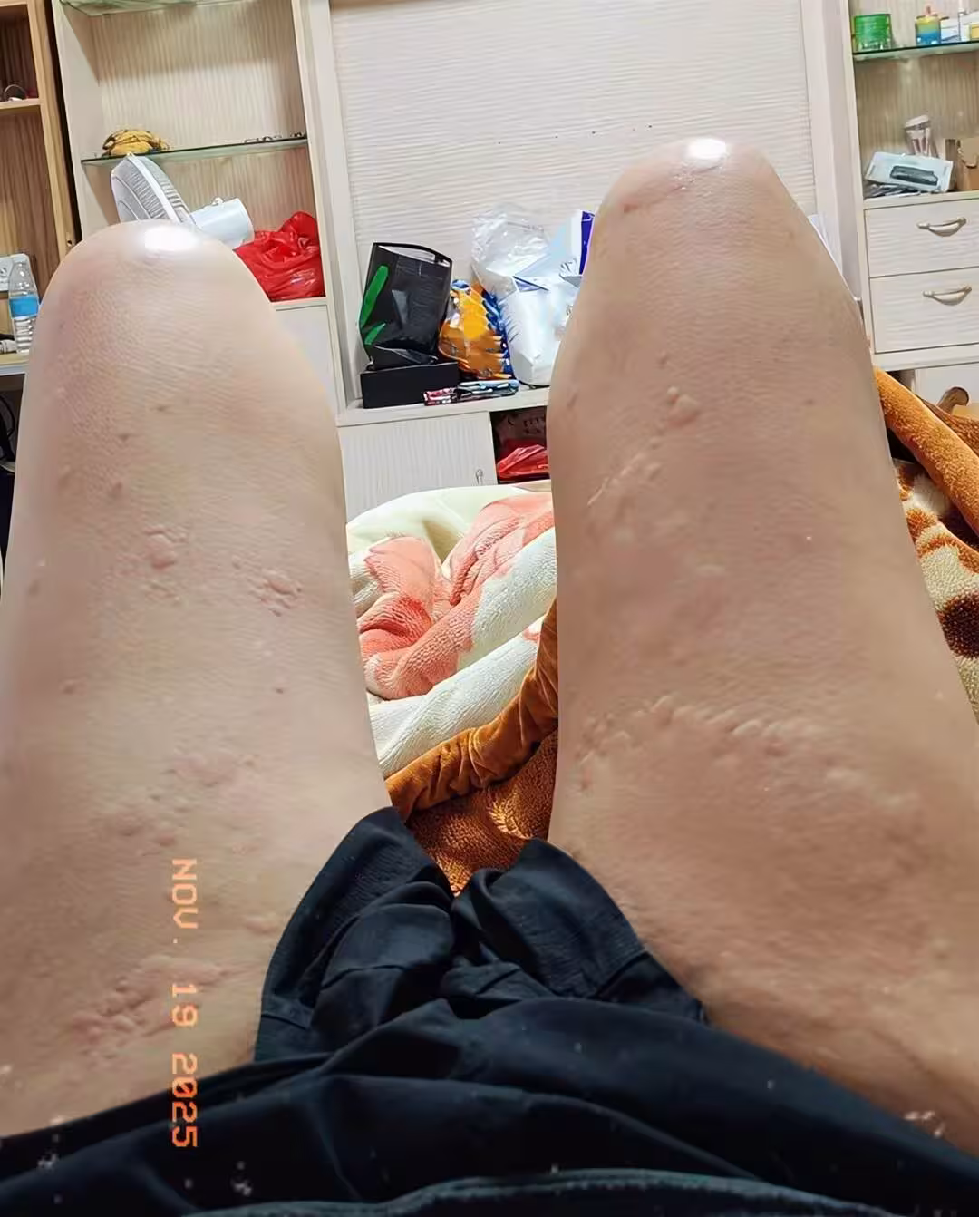 推文人用「大半夜醒來我直接懵了」描述驚魂一刻:雙腿雙腳突然冒出密集疙瘩,瘙癢難忍到「抓一下就腫一片」,嚴重到早上無法穿鞋。焦急詢問「該掛哪個科?有沒有同款經歷?「時,評論區秒變急診室:網友齊聲指認蕁麻疹(俗稱風疙瘩),警告此為免疫力下降信號,強烈要求立即就醫皮膚科。更有人點出致命風險: